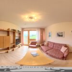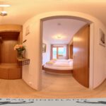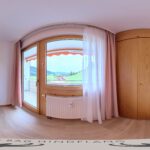 Helles Schlafzimmer in der Ferienwohnung des Die Gams Hotel Resort in Bad Hindelang mit Doppelbett, Einbauschrank aus Holz und Zugang zum Balkon.